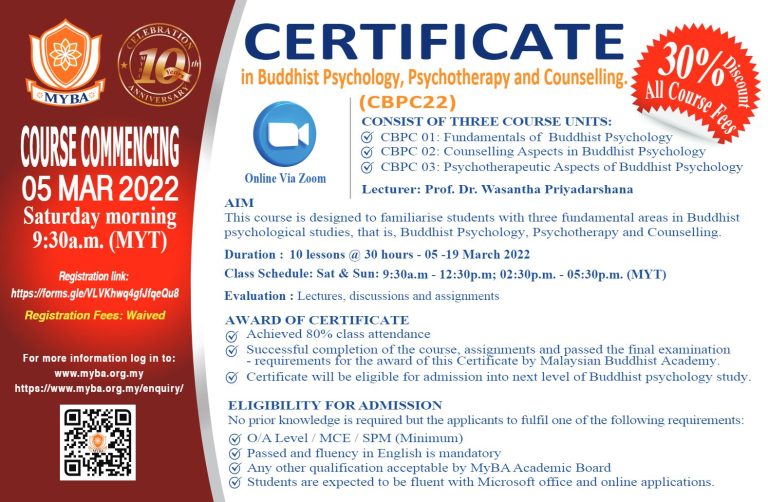 Certificate in Buddhist Psychology & Counselling (CBPC22) – New Intake for March 2022 Read More » January 2, 2022