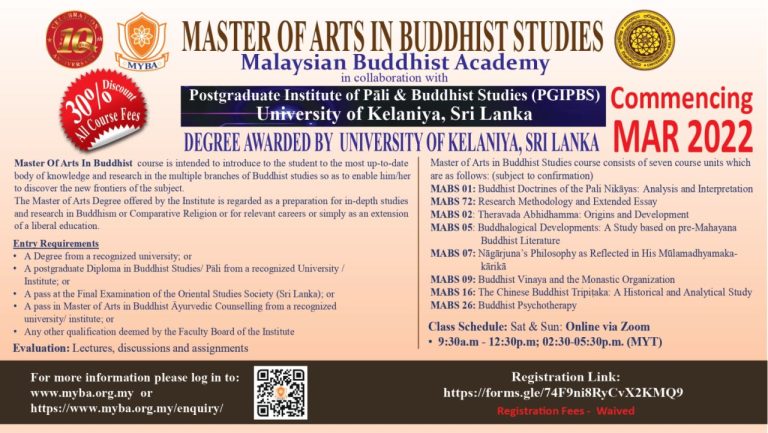 Master of Arts in Buddhist Studies (MABS2022) – New Intake Commencing March 2022 – PGIPBS, University of Kelaniya, Sri Lanka Read More » January 4, 2022