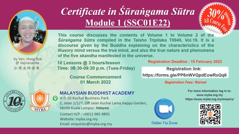 Śūraṅgama Sūtra Certificate Course (SSC01E22) – New Intake for March 2022 Read More » January 1, 2022